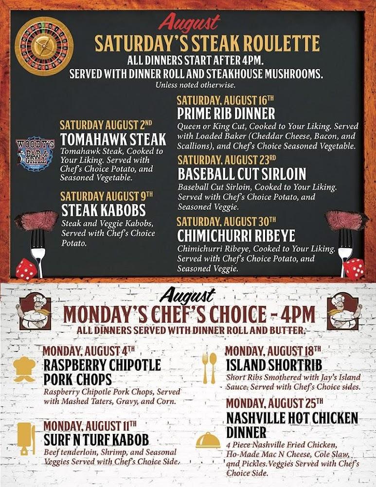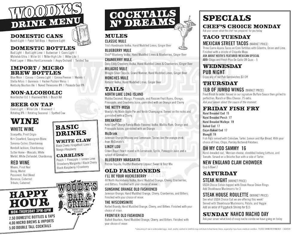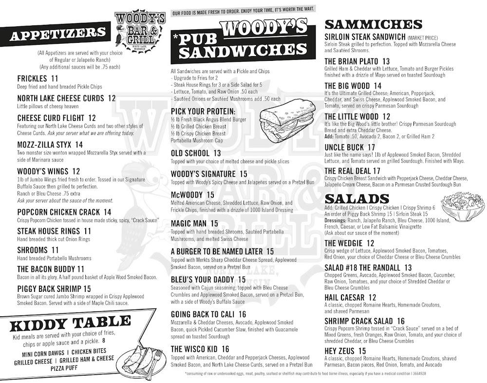 The menu at Woody's Bar & Grill features a delightful mix of smoked specialties and classic grill items. Expect hearty portions at affordable prices. Signature items include juicy burgers, fish fries, and unique appetizers like fried mushrooms.